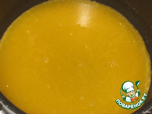 Из апельсина выжать сок, получилось 150 мл, добавить сахар и поставить на огонь, довести до кипения и уварить на 1/3, примерно 10 минут на среднем огне. Далеко от него не отходите, пена поднимается огромная, надо постоянно помешивать лопаточкой.