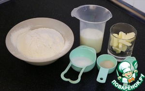В миске соединяю молоко с дрожжами, растопленное остывшее! сливочное масло, оставшийся сахар, соль и 2/3 муки. На минимальной скорости замешиваю тесто (или руками).