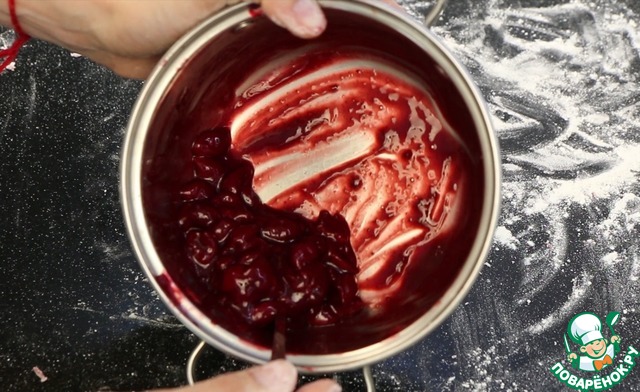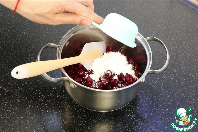 В кастрюльке вишню пересыпаю крахмалом, сахаром, ванилином, перемешиваю...