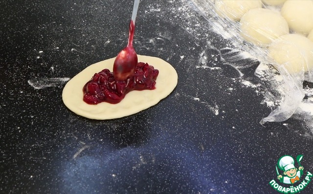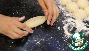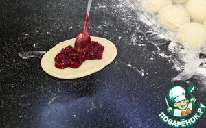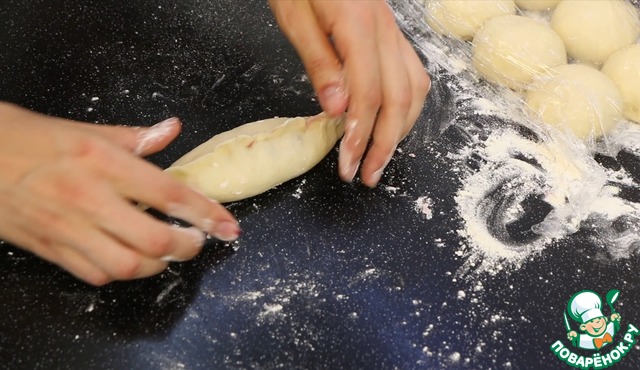 Раскатываю в небольшой овал, кладу 2,5-3 ч. л. начинки и аккуратно защипываю края. Раскатанное тесто мукой сильно не припыляю, так стык будет лучше склеиваться. Еще важно, чтобы сок не попал в шов, иначе пирожки по время выпечки разойдутся. Если руки будут липнуть к тесту, слегка обваливаю (руки) в муке.