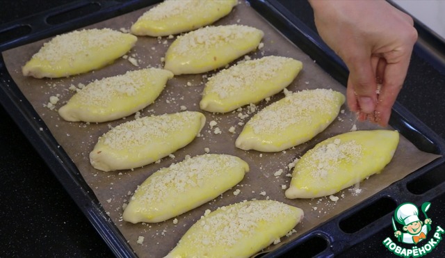 Хорошо защипываю шов и укладываю на противень швом вниз.