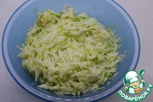 Кабачки помыть и натереть на крупной тёрке. Посолить и оставить минут на 10, чтобы пустили сок. Затем хорошо их отжать.