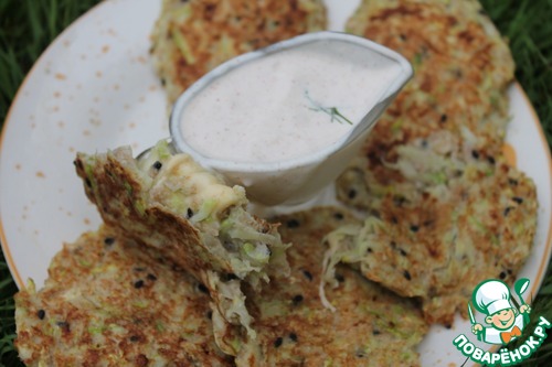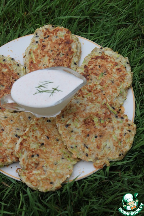 Вкусные и полезные оладьи из кабачка с пикантным соусом. За рецепт оладий спасибо Yuliya Small.