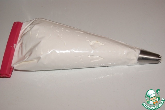 ... отсадить безе на противень застеленный пекарской бумагой (бумагу приклеить к противню небольшим к-вом меренги, чтобы было удобно работать). Можно отсадить меренгу и с помощью ложки.
