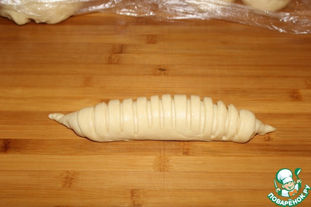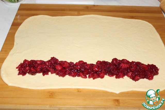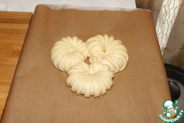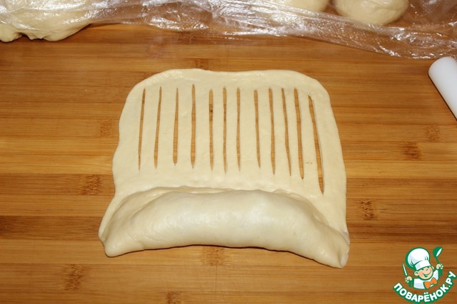 Раскатываем оставшееся тесто в пласт толшиной 3 мм, длинной равной диаметру трех булочек. Выкладываем начинку.