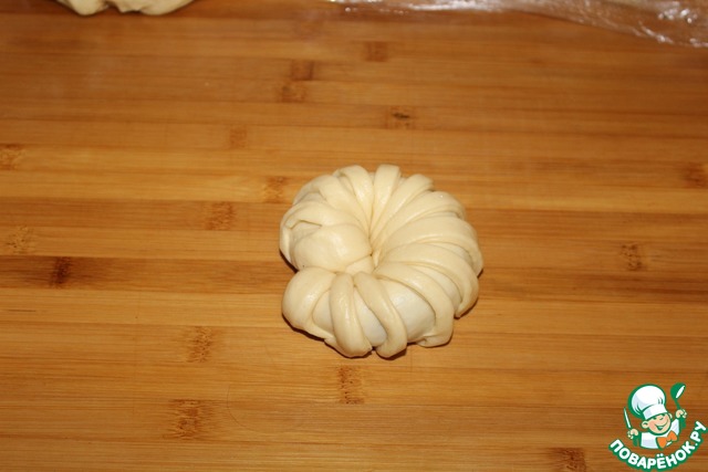 Выкладываем получившийся рулет вокруг булочек. Концы заправляем под булочки. Прикрываем пленкой и оставляем на подъем на 30 минут. После подъема смазываем желтком разведенным 1 ст л воды.