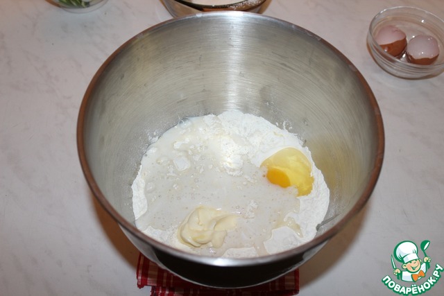 Добавляем яйца и сливочное масло. Замешиваем тесто.
