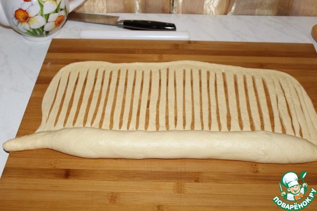 Прикрываем начинку свободным краем теста, хорошо защипываем. Делаем надрезы не доходя до края.