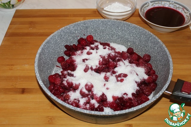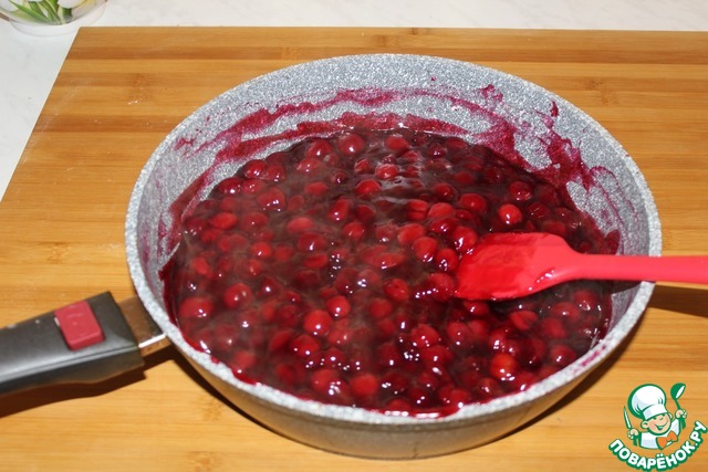 Добавляем разведенный крахмал в вишню. Хорошо перемешиваем. Доводим до кипения и при постоянном помешивании провариваем 1 минуту. Полностью остужаем.