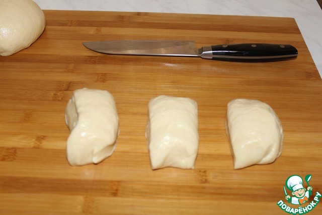 Меньшую часть делим еще на 3 равные части. Подкатываем каждый кусочек. Прикрываем пленкой и даем отдохнуть 15 минут.
