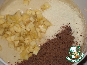 добавить в банановый мусс кокосовую стружку, шоколад и порезанный банан.