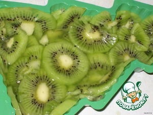 Затем кружочки киви выложить внахлест по всему дну формы, сделать небольшие бортики, сверху киви также немного сбрызнуть желатиновой водой.