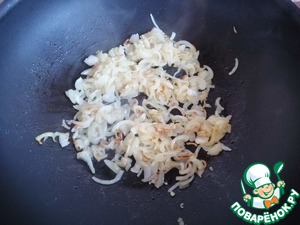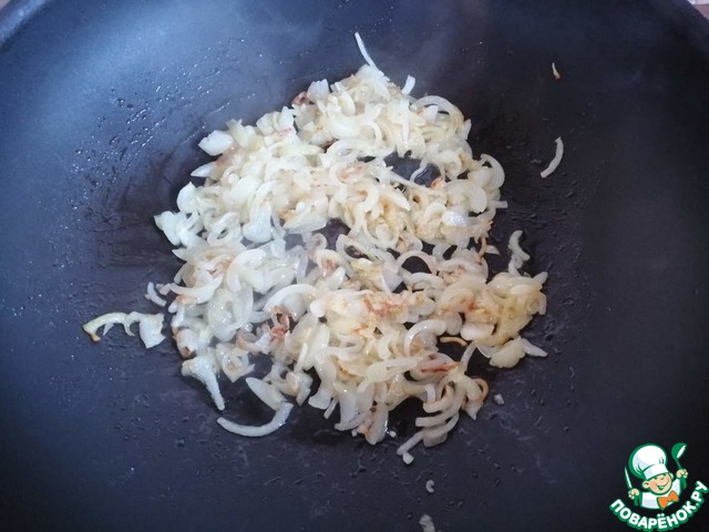 Репчатый лук очистить и нарезать полукольцами. На оливковом масле спассеровать лук до прозрачности.