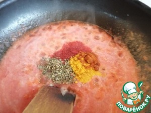 Помидоры помыть и поместить в чашу блендера. Сделать томатное пюре и вылить его в сковороду. Добавить все специи, перемешать и потушить 3 минуты.