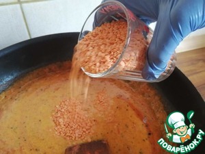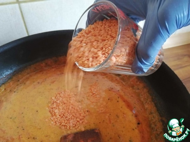 В томатно - кокосовый соус со специями добавить красную чечевицу. Посолить по вкусу, накрыть крышкой и томить на медленном огне 15 минут.