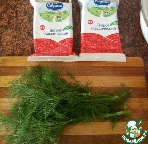 • Две пачки творога выкладываем в тарелку. Мелко режем укроп и бросаем в туда же, давим в чеснокодавилке чеснок.