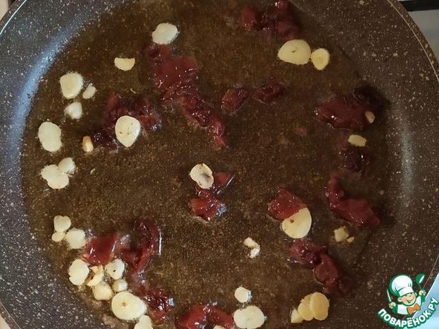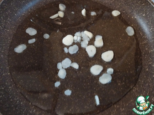 Разогреваем масло и обжариваем в нём, нарезанный дольками, чеснок до золотистого цвета.