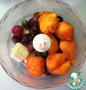 Абрикосы и крыжовник вымыть. Удалить косточки у абрикос и удалить хвостики у крыжовника. Сложить в чашу блендера абрикосы, крыжовник и кусочки банана, взбить блендером.