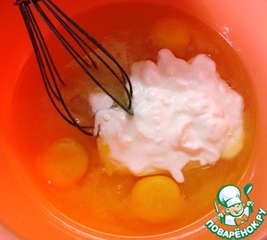 • Всыпать муку, щепотку соли, разрыхлитель теста и мак. Тщательно перемешать до однородного состояния (тесто с ложки не стекает, по консистенции - как густая сметана).