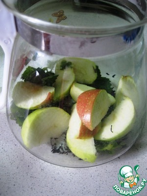 Закипятить воду. Насыпать черный чай в удобную для заваривания посуду (количество чая можно регулировать на свой вкус), добавить листики мяты, кусочки яблок.