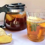 Добавить кусочки персиков и нарезанный небольшими кусочками имбирь. Залить кипятком, перемешать и дать остыть. Для сладости - добавляем мед по вкусу. Остывший чай подаем с кубиками льда.