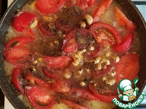 Добавим помидоры, кешью, воду. Перемешаем. Добавим чесночный порошок, соль, чили, гарам масалу, тмин, сахар, уксус. Варить на медленном огне 15-20 минут.