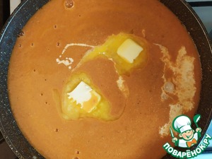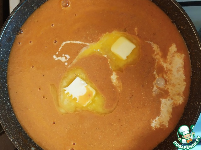 Вылить обратно в сковороду. Добавить 45 грамм масла, сливки. Растопить масло, перемешать.