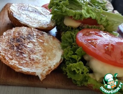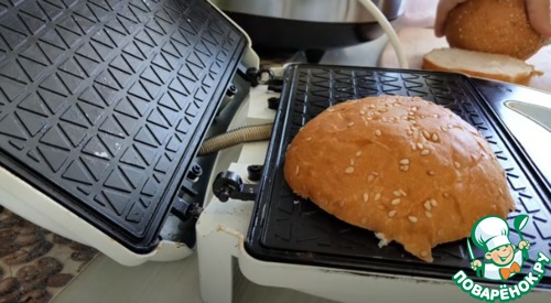 Когда сыр расплавится выкладываем ингредиенты на булочку в следующем порядке: