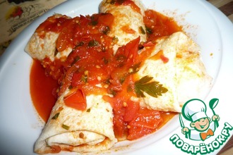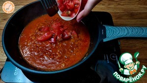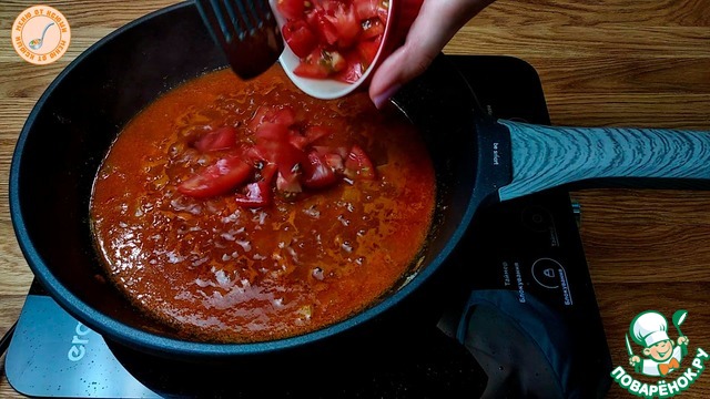 Шаг 7 В этой же сковороде обжарить лук, добавить бульон, помидоры, протушить обжаренное филе 8 минут, добавить оливки, каперсы, базилик