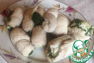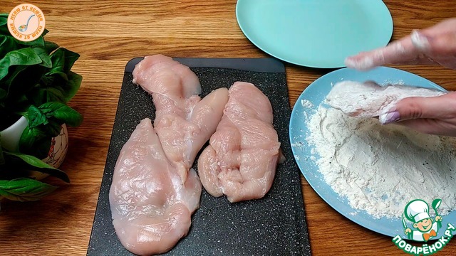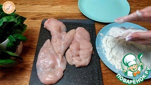 Шаг 5 Куриное филе я просушить и разрезать на 2 части. В муку добавить соль и перец и обвалять в ней филе