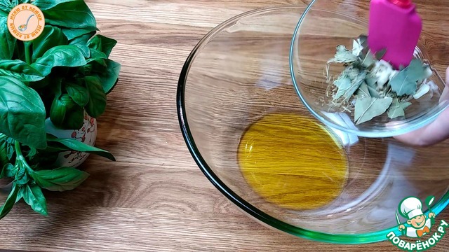 Шаг 2 Приступаем к приготовлению маринада. Берем чеснок и режем на небольшие слайсы и складываем все в миску. Добавляем несколько лавровых листиков и немного сушеного розмарина