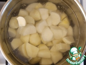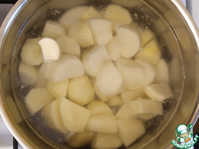 Очистим картофель и чеснок. Положим их в холодную воду, поставим на огонь, доведём до кипения, посолим. Убавим огонь и будем варить до готовности.