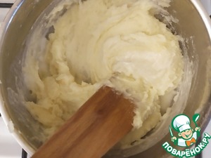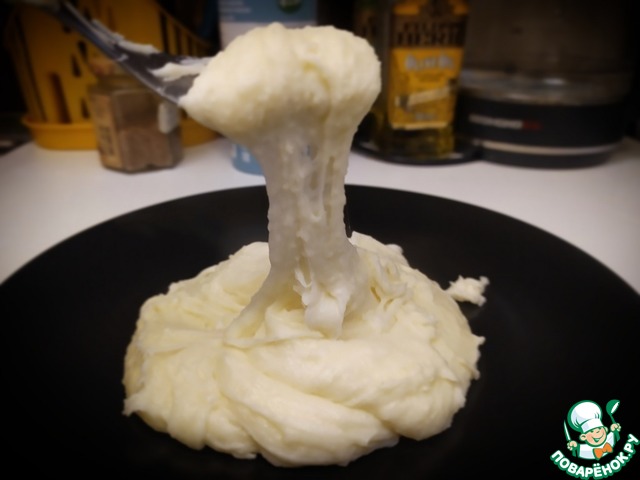 Закончив со сливками, добавляем сыр и начинаем долго и упорно перемешивать. Чем дольше, тем лучше. В результате мы должны получить плотную, тягучую массу.