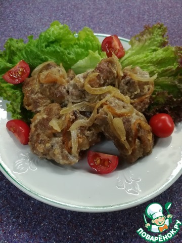 Печенку запанировать в муке и обжарить в масле с двух сторон.
