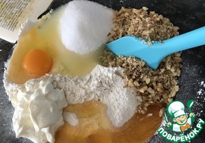 В миску просеять муку, положить -мед, сахар, сметану, растопленное сливочное масло, ваниль, Куриное яйцо, грецкие толченые орехи.