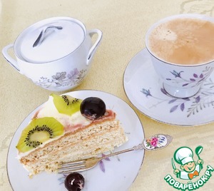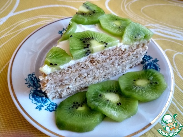 [+2]Коржи выпекались порядка 20 минут, получились тоньше за счёт большего диаметра, мягкие и рассыпчатые. Количество крема смело можно увеличить в 1,5-2 раза. Киви отлично подошёл для украшения.
