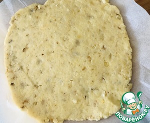 Разрезать на три равных кусочка. Раскатать пышки на пекарской бумаге, с этой бумагой перести в форму 23d