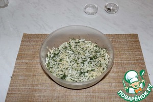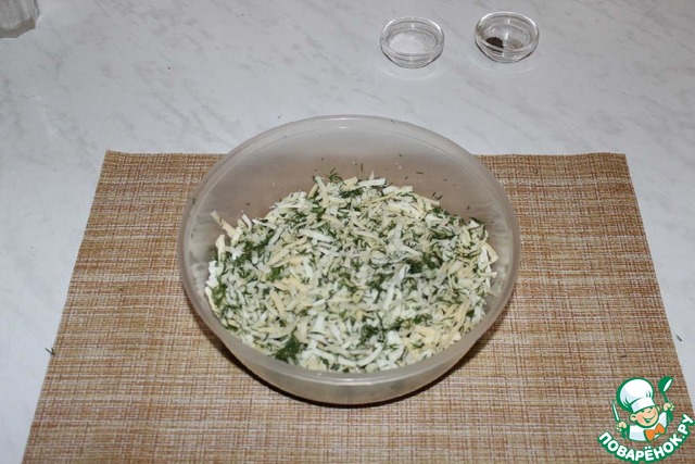 Готовим начинку. Сыр натираем на крупной терке. Укроп мелко нарезаем.