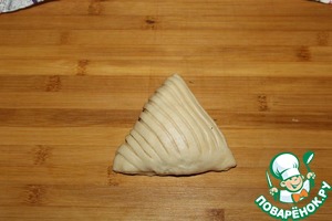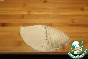 Раскатываем в круг толщиной 3-4 мм. На половине круга делаем надрезы не доходя до края.