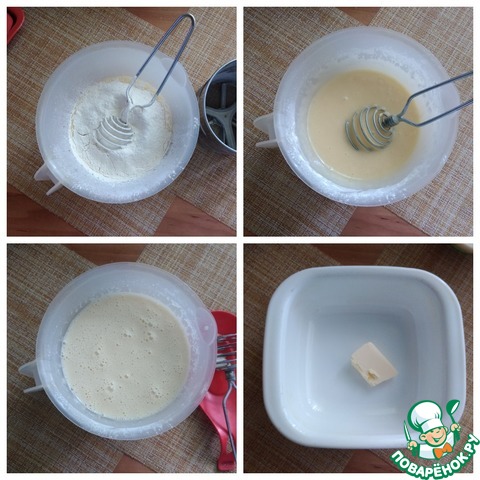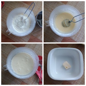Смешать муку, сахар, яйца и 50 мл сливок 10 % до состояния гладкого теста. Долить ещё 150 мл сливок и дать постоять тесту 10 минут. Сливки 10 % иногда заменяю жирным молоком и добавляю в него растопленный кусочек сливочного масла примерно 20 г. Приготовить формы для выпекания: силиконовые; стеклянные огнеупорные; керамические огнеупорные или противни для духовки. Смазать форму маслом и присыпать слегка мукой. Я возьму огнеупорную керамическую форму 20Х20 см.