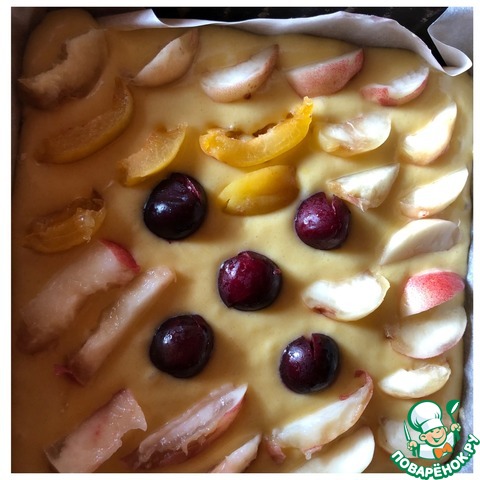 Тесто вылить в форму (20-22 см), распределить абрикосы и нектарин нарезанные дольками. У вишни удалить косточку и выложить ягоды чуть утапливая их в тесто. Отправить пирог в духовку на 40-50 минут при 180 гр. ориентируйтесь на сухую деревянную шпажку.