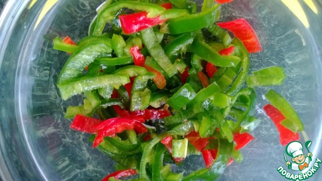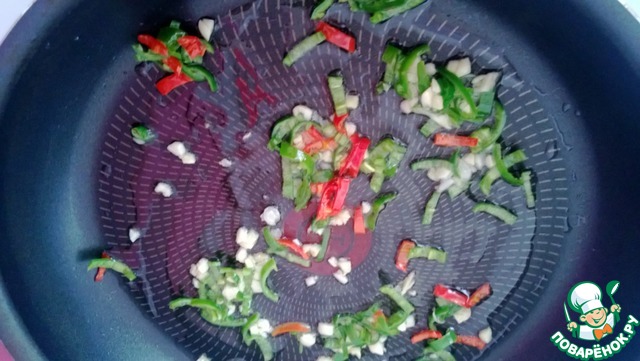 Нарежьте мякоть чили тонкими полукольцами. Сбрызните маслом, чуть-чуть посолите и перемешайте. -