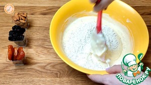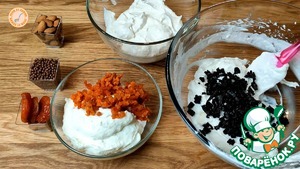 Распустить желатин. Взбить сливки с пудрой. Ввести йогурт в желатин. Добавить сливки. Распределить на 3 части, добавить сухофрукты