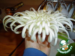 Вырезанную хризантему положить в ледяную воду. Если кончики лепестков будут достаточно тонкие, то в воде они красиво загнутся.