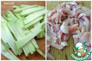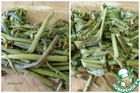 Свежий папоротник отварить в течении семи минут с добавлением 0,7 столовой ложки соли. Промыть. Порезать на отрезки длинной пять сантиметров. Если воспользоваться соленым папоротником, то его нужно вымочить в воде, не менее трех часов, меняя воду, затем отварить минут пять, без добавления соли.