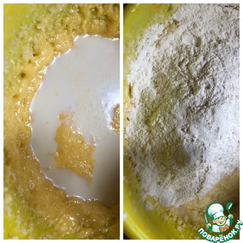 • Влить молоко, перемешать. Всыпать муку и разрыхлитель, взбить секунд 30.