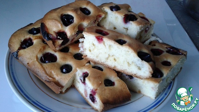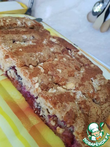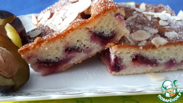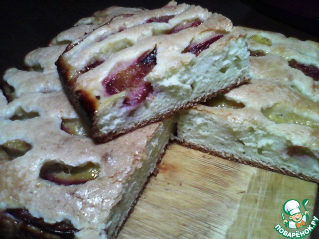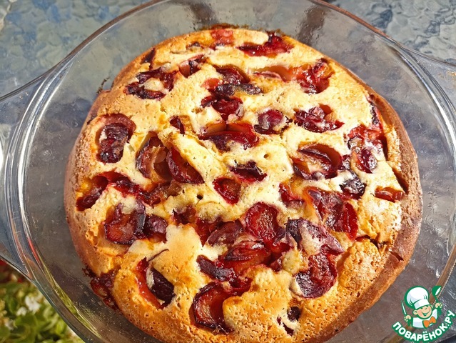 Пекла в форме 25*40 и всё равно получился высоким - сливы ушли внутрь. Правда, разрыхлителя положила 15г.