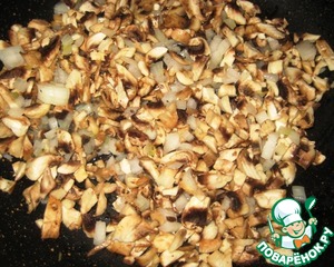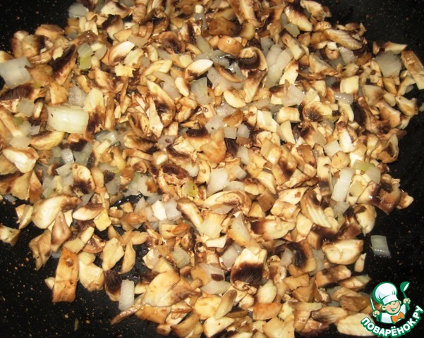Лук и шампиньоны нарезать небольшими кубиками. Разогреть на сковороде растительное масло и обжарить лук/грибы, затем снять с огня и дать остыть.