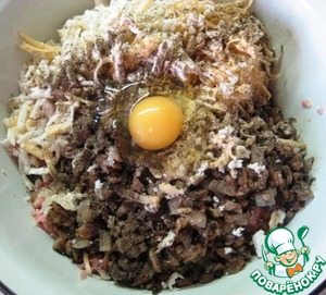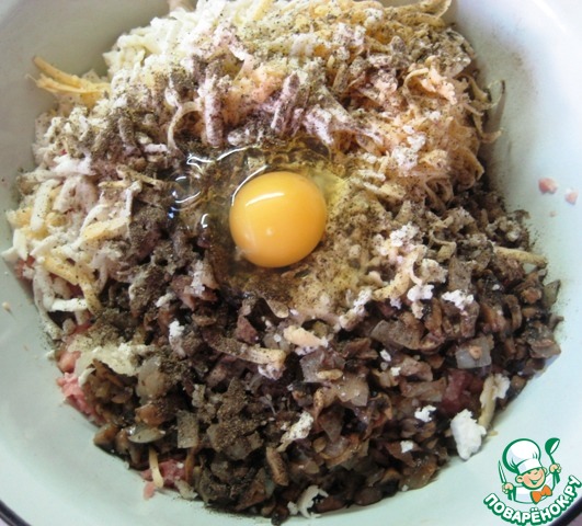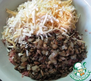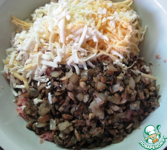 В миске соединить два вида фарша, добавить остывшие шампиньоны+лук, натертый голландский и адыгейский сыр.