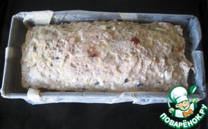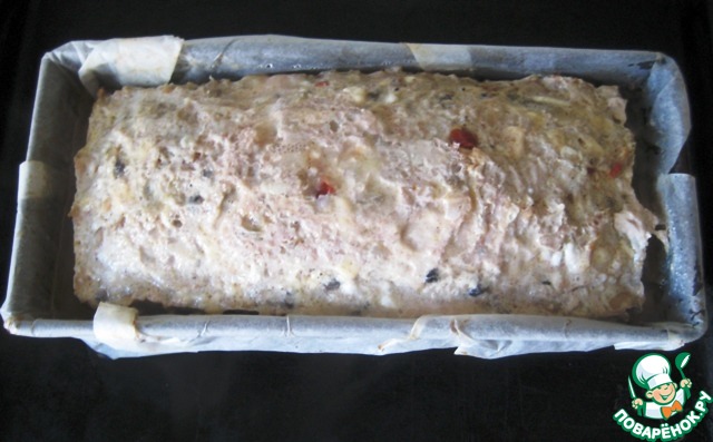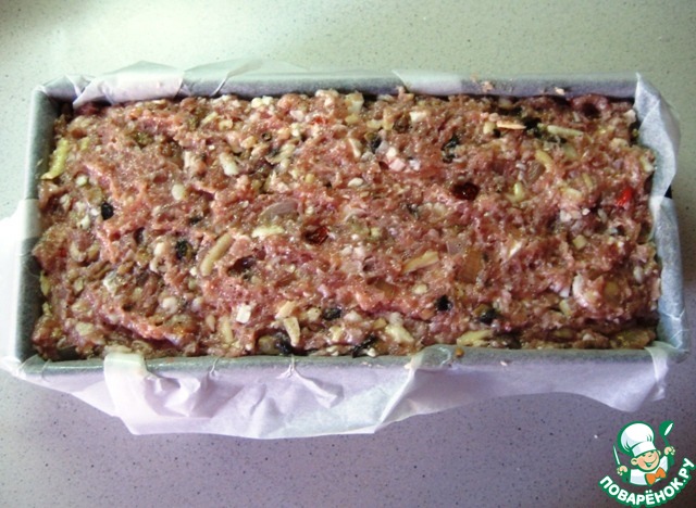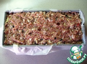Выложить фарш в прямоугольную форму (размер формы шир.11 см, выс. 7 см, дл. 25 см; застелила пергаментом и бортики смазала растительным маслом).